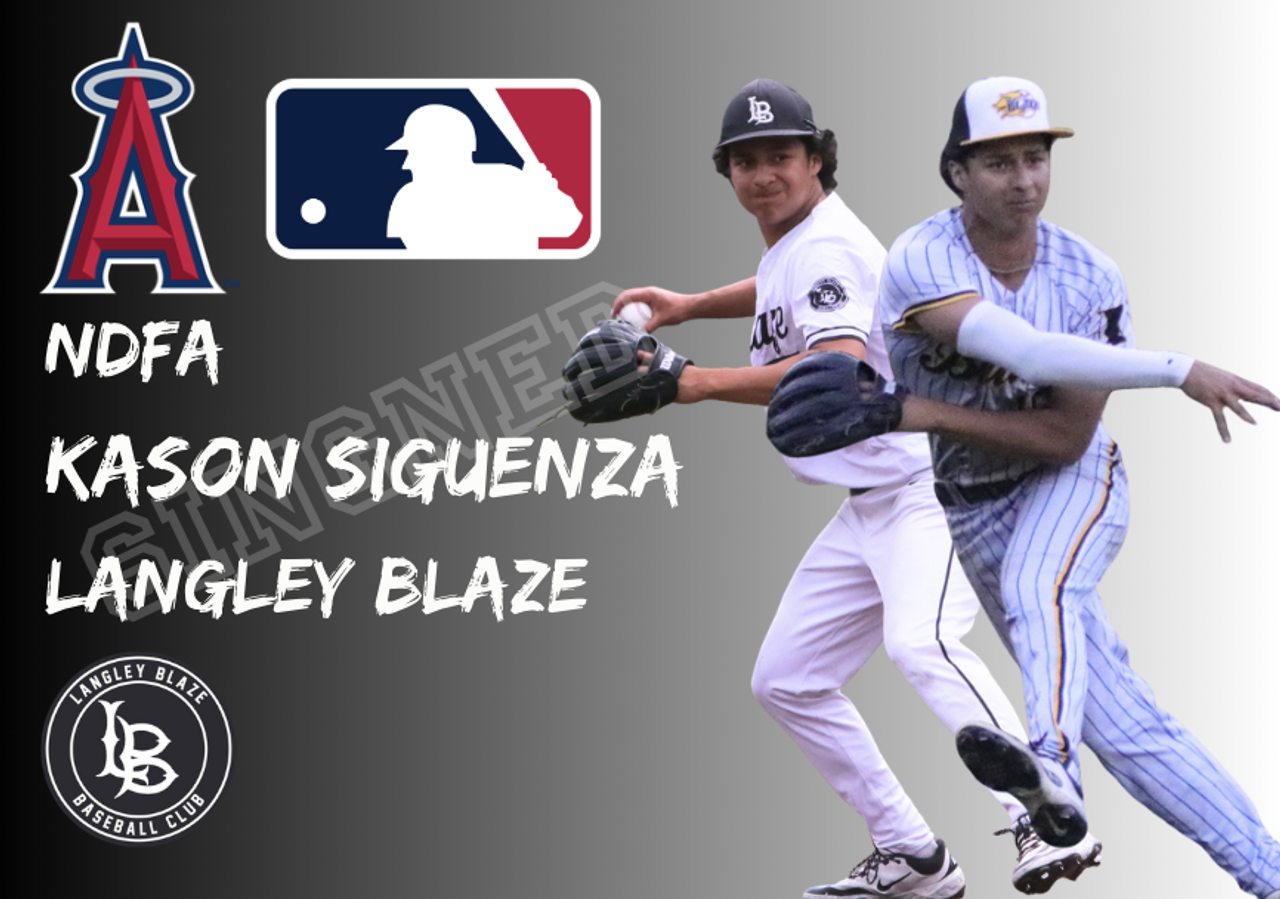 The BC Premier Baseball League (BCPBL) is proud to announce that Kason Siguenza of the Langley Blaze has officially signed his professional contract with the Los Angeles Angels, marking an exciting milestone for both Kason and the BCPBL community.